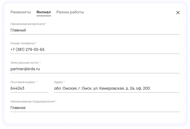 Если Вы регистрируетесь как физическое лицо - можно заполнить пункт Дополнительно, где нужно ввести реквизиты компании: ИНН и фактический адрес, контактные данные и адрес филиалов, а также время работы. Эти данные необходимы при работе с документами Вашего бизнеса.