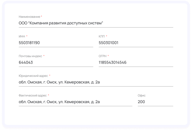 Если Вы регистрируетесь как юридическое лицо - вторым обязательным шагом будет заполнение информации об организации, где нужно ввести реквизиты компании: ИНН, фактический и юридический адреса с индексом, КПП, ОГРН.